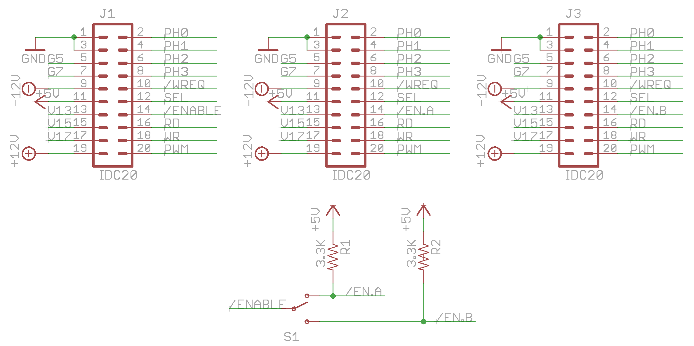 The board design is about as simple as it gets. A 20-pin ribbon cable connects the “IN” port to the computer’s logic board. The Floppy Emu is attached to “Disk A” and the real floppy drive to “Disk B”, or the other way around – it doesn’t matter. All of the power and data signals are shared between all three of the connectors on the A/B board, except for the ENABLE signal. By moving the A/B switch, you can alternately connect the computer’s ENABLE signal to either Disk A or Disk B. Both disks also have a 3.3K ohm pull-up resistor on their enable inputs, to ensure they’re disabled while they’re not selected with the switch.